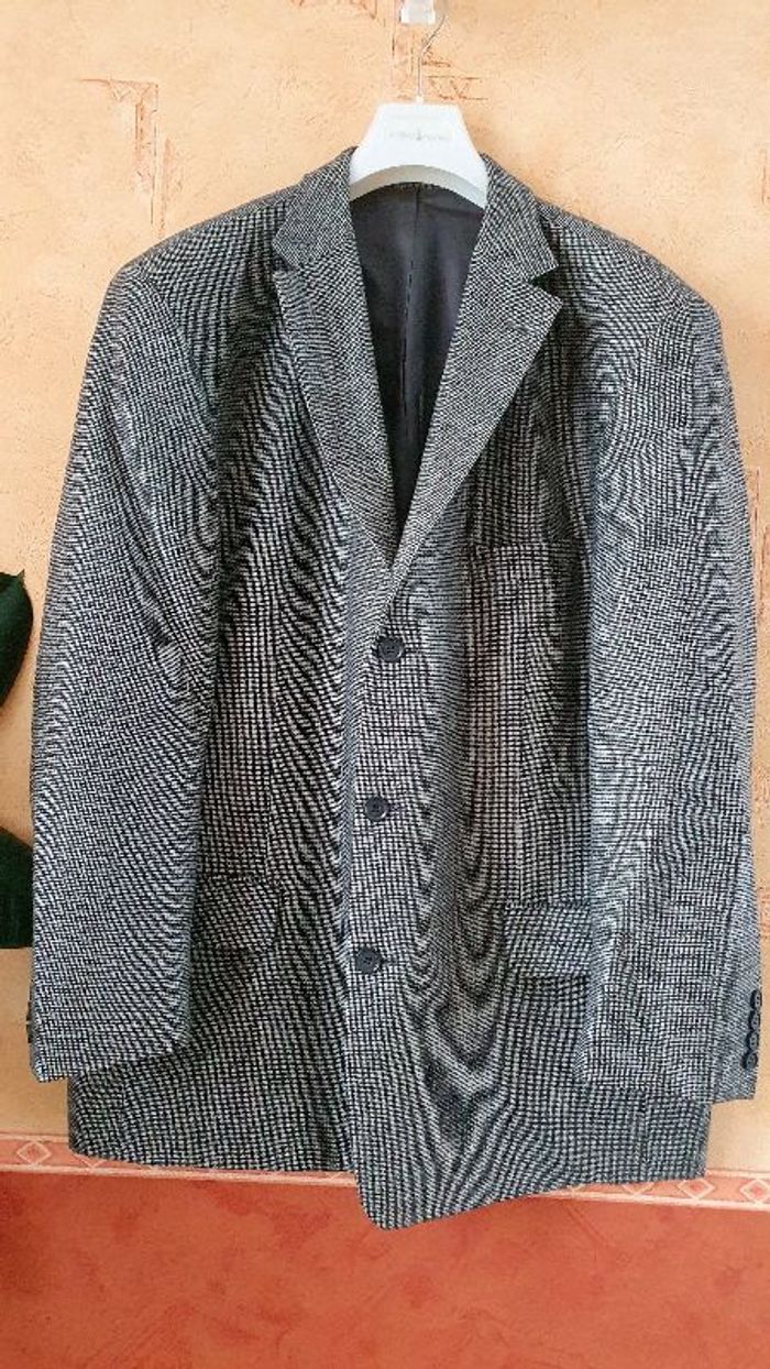 Veste grise en pur laine vierge et entièrement doublée, fermeture à 3 boutons. 2 poches extérieures et 4 poches intérieures. Une des poches intérieures un peu déchirée. Longueur 80cm Largeur aisselle à aisselle 66cm Longueur manches 60cm. Veste en pur laine vierge, doublure 100% viscose.