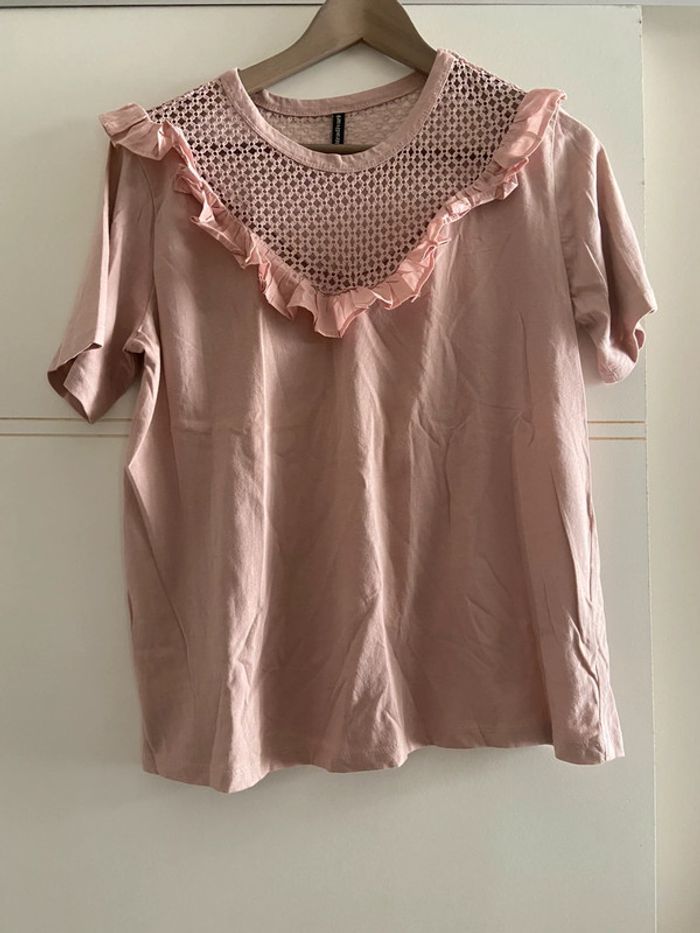 T-shirt vieux rose à froufrous et dentelle stradivarius - photo numéro 1