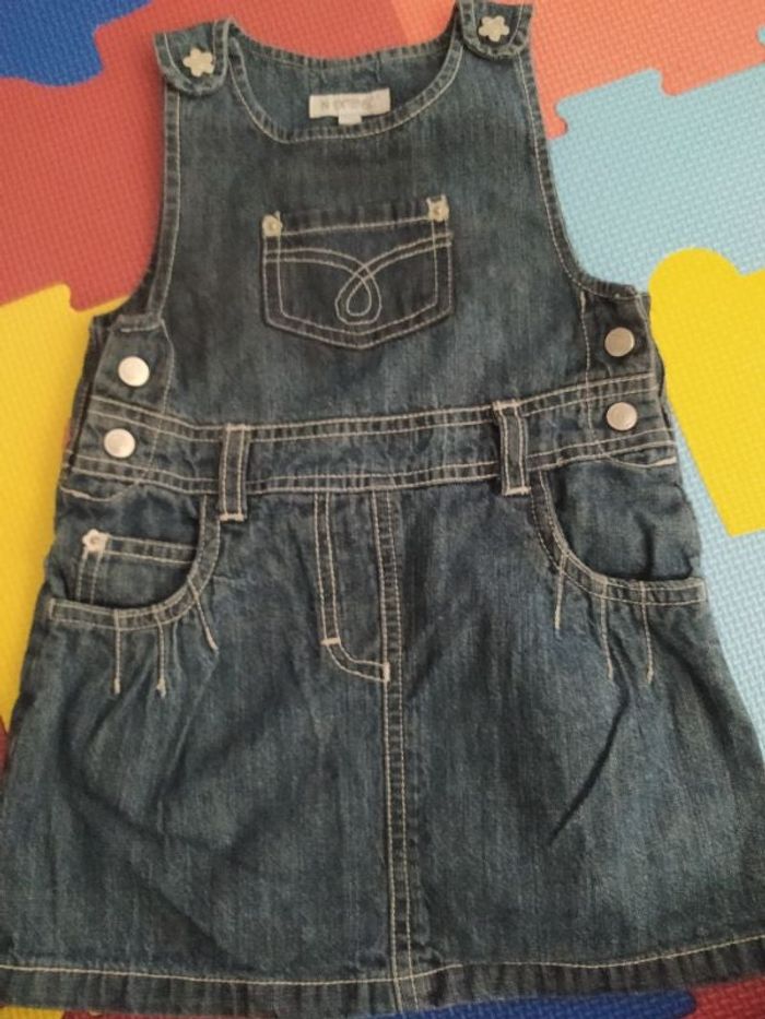 Robe salopette en jean. Fermeture pression en forme de fleurs. N'hésitez pas à faire des lots en filtrant par taille si vous voulez 😉