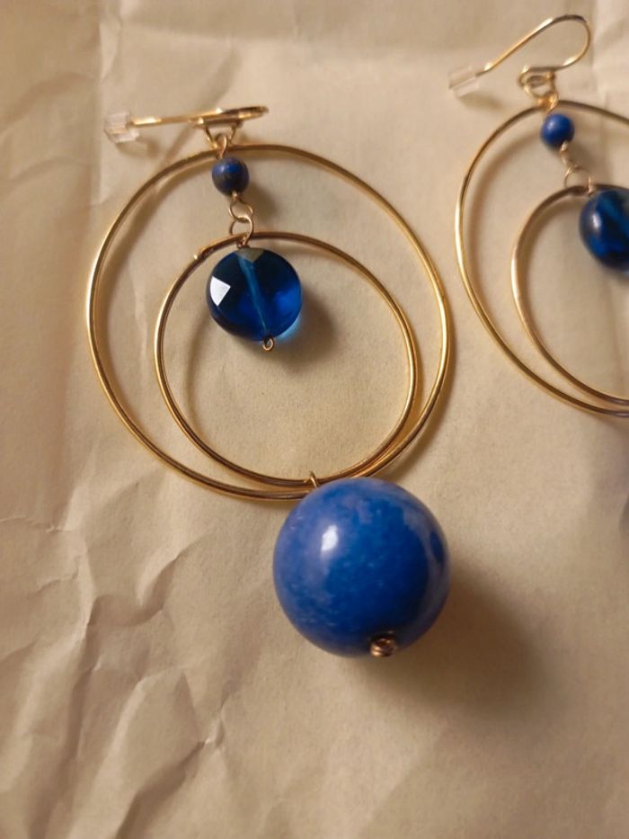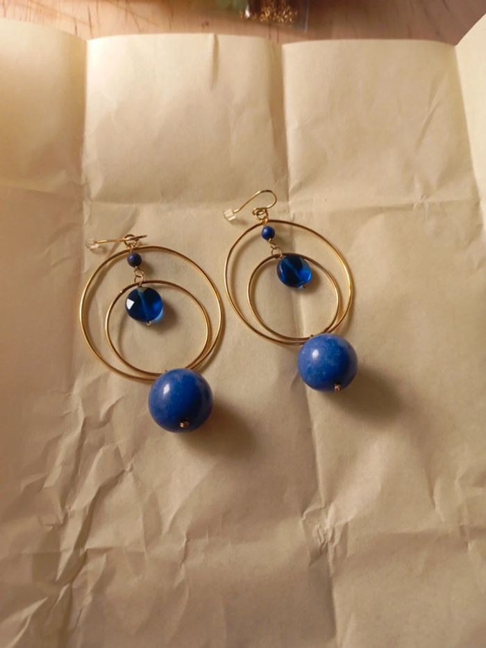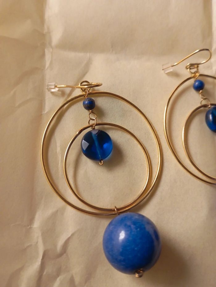 Anneaux doré suspendu grosse boule bleu lapiz lazuli
