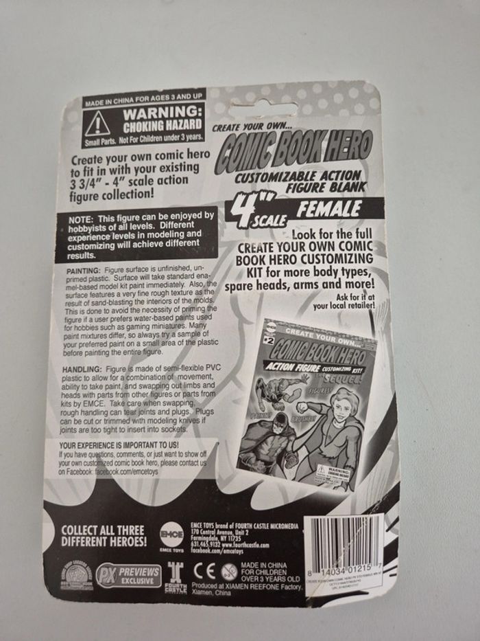 🦸‍♂️ Figurine vierge "Create Your Own Comic Book Hero" – EMCE Toys (PX Previews Exclusive) Neuf sous blister Libérez le super-héros qui sommeille en vous avec cette figurine entièrement personnalisable de 10 cm (4") ! 👨‍🎨 Version Athletic Female – Blank : corps blanc, cape amovible, 2 têtes incluses 🛠️ Parfait pour les fans de DIY, les créateurs de personnages originaux ou les artistes custom 📦 Édition exclusive Previews PX – difficile à trouver, encore sous son blister d’origine. Une base idéale pour donner vie à votre propre Comic Book Hero ! 📸 Photos 100% contractuelles – n'hésitez pas à zoomer pour voir les détails. 📦 Expédition rapide & ultra-soignée : 💨 Commande expédiée sous 24h maximum (hors mercredi et dimanche – dépôt fermé) pour une réception rapide et sans stress ! ➡️ Envoi via Mondial Relay / InPost sous 48h. ⚠️ Pas d’envoi via Vinted Go / Homerr