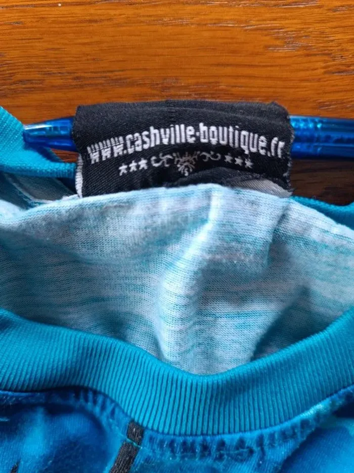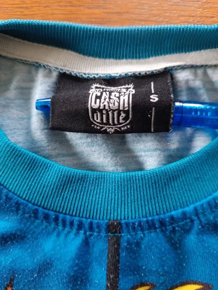 T-shirt bleu Yakuzza S. Cash Ville. Épaules 40 cm. Aisselles 52 cm. Longueur 62 cm. 100% polyester. TBE