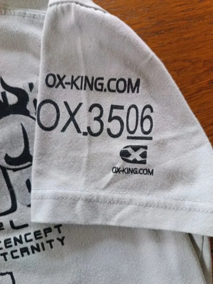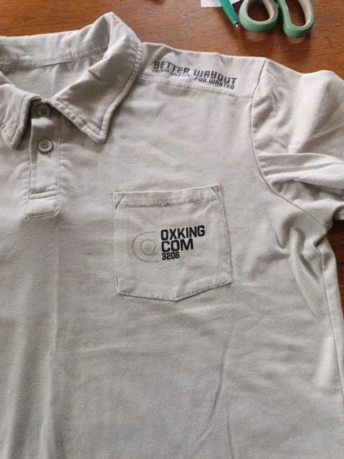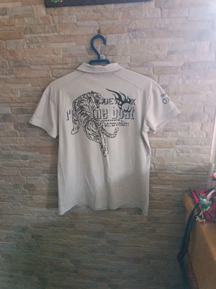Polo gris Ox-King S. Épaules 42 cm. Aisselles 50 cm. Longueur 60 cm. Manches courtes. 85% coton. 10% polyester. 5% élasthanne. Bon état