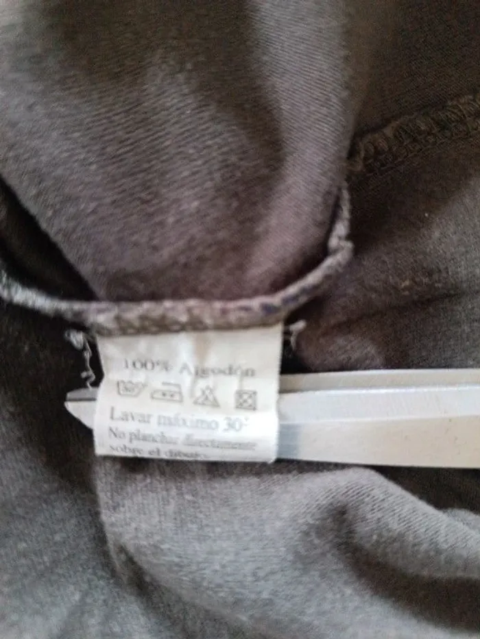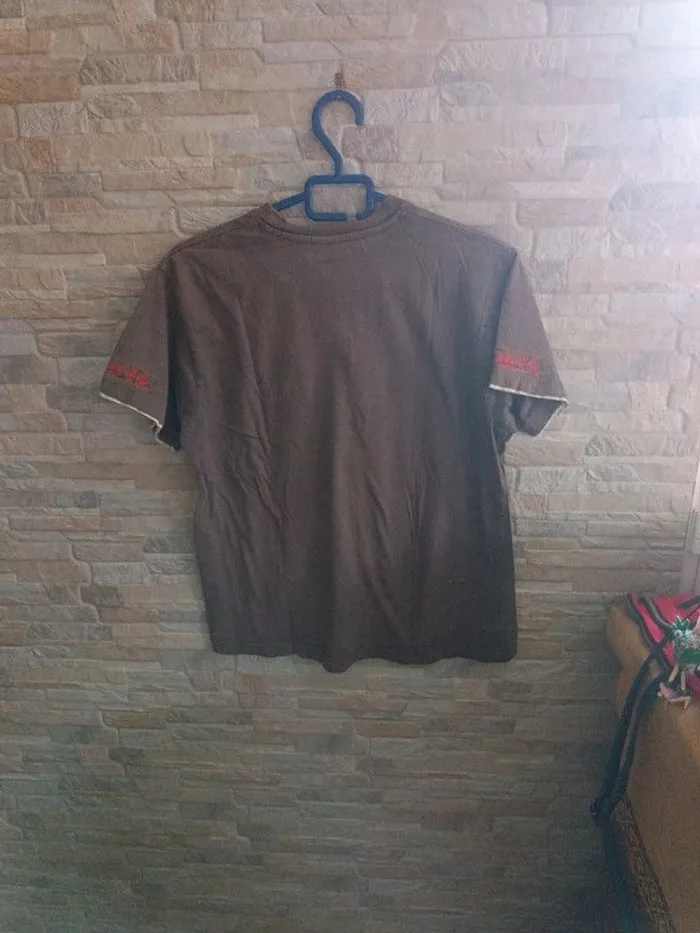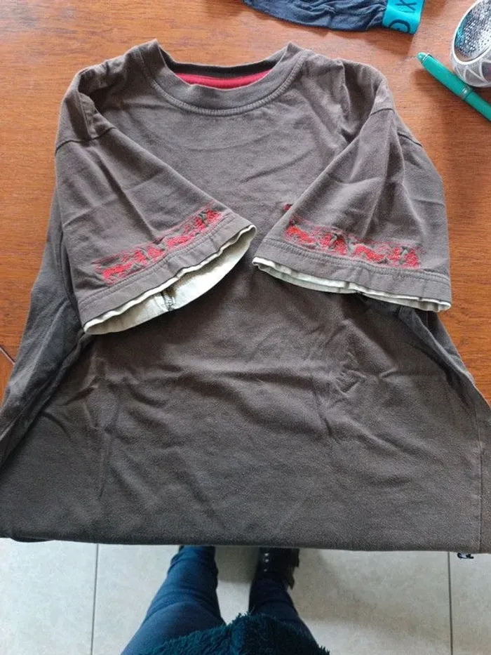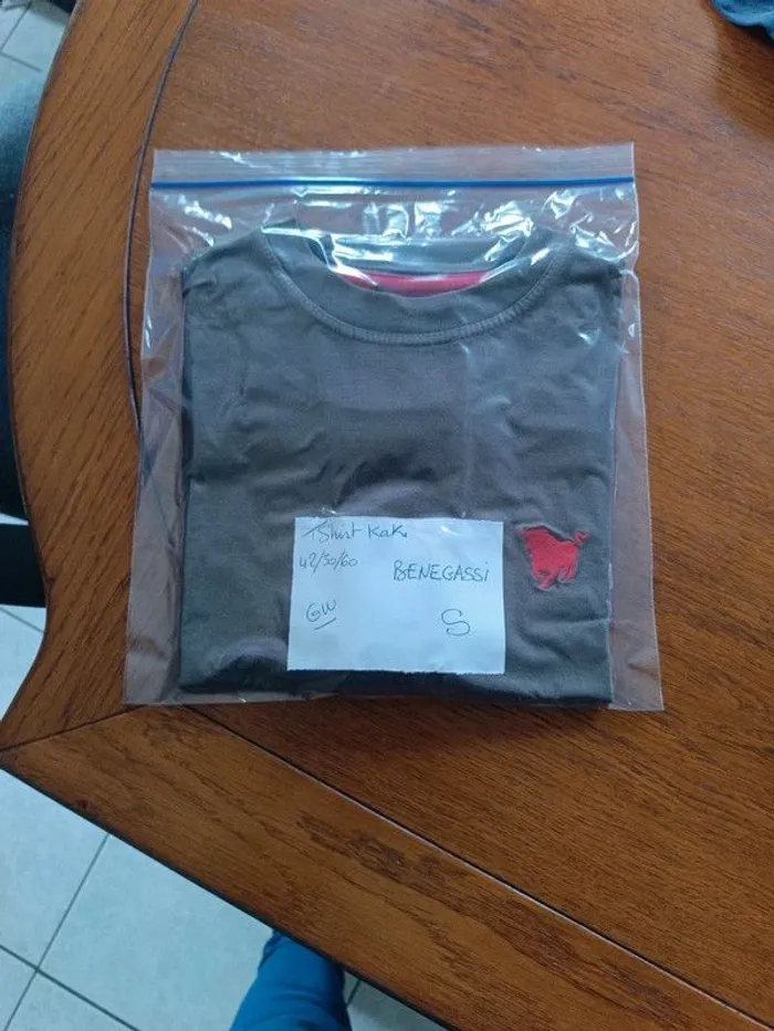 T-shirt kaki/rouge, Benegassi S. Épaules 42 cm. Aisselles 50 cm. Longueur 60 cm. Manches courtes. 100% coton. TBE