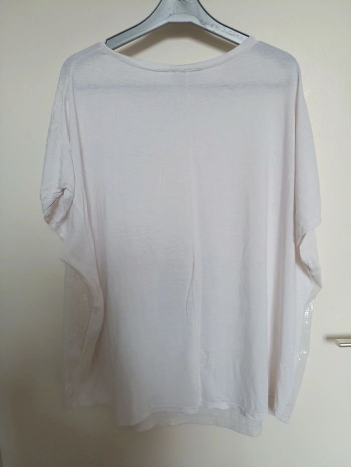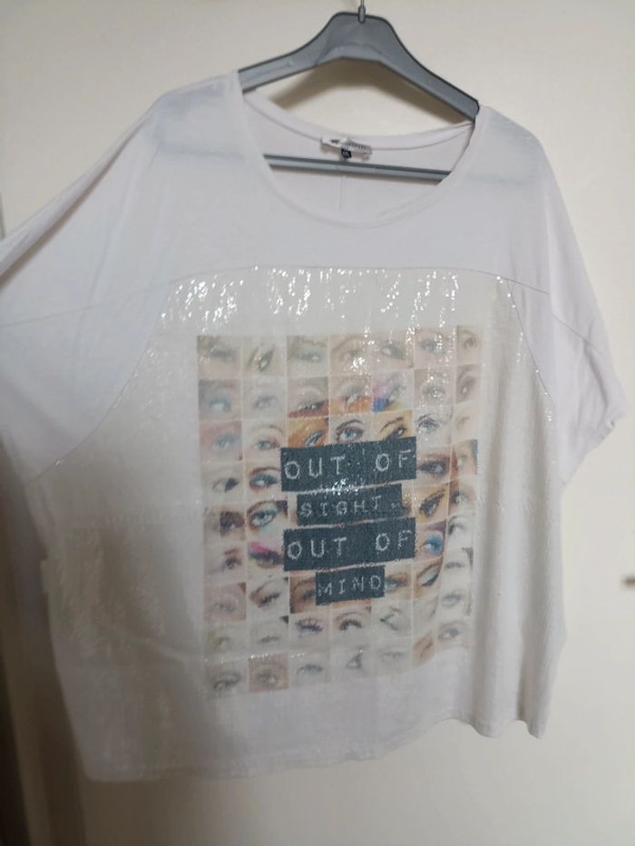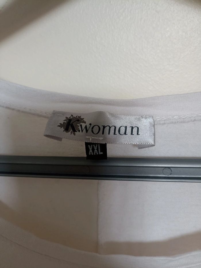 T-shirt femme Kiabi taille XXL Blanc léger avec motif devant En très bon état 62% polyester 33% viscose 5% elastanne Longueur : 68cm Épaules à épaules : 45 cm