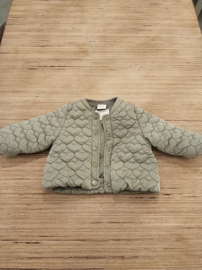 Jolie veste matelassée verte kaki avec finition paillette au col. Motifs coeur
