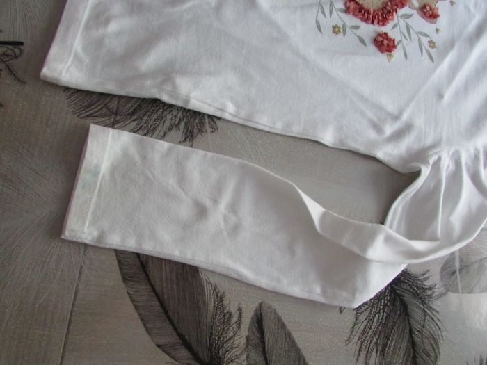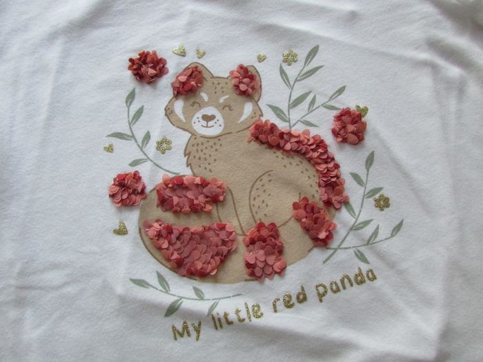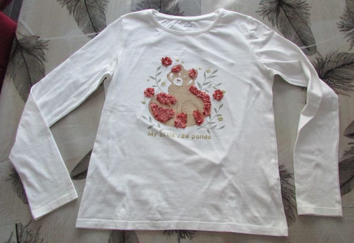 T-shirt à manches longues pour fille avec print Panda roux et relief, en très bon état sauf au niveau de l'avant des manches où il y a des tâches que je n'ai pas réussi à enlever. Cela reste discret malgré tout donc je pense qu'il peut encore faire une heureuse ;)