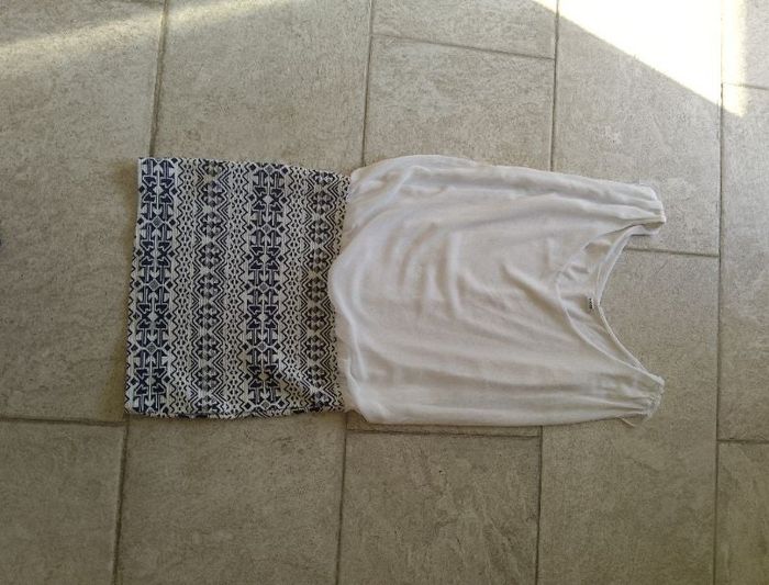 Robe courte, chic simple ,passe partout.le haut est en voile, le bas en tissu extensible. Longueur de l'épaule au bas= 78 cm, le tour de taille est de 71 cm. Manque l'étiquette de taille mais je fais un 34/36 et elle me va. Très Bon état.