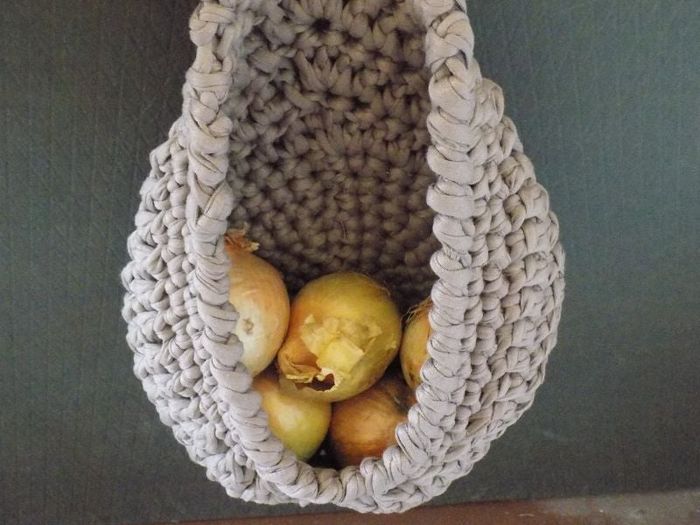 Panier rond à suspendre couleur marron, réalisé 100% à la main avec du trapilho (fil recyclé), qui est un mélange 90% coton et 10% polyester. Idéal dans une chambre pour etre utilisé en range-pyjama, dans la salle de bain pour les chaussettes ou encore dans la cuisine pour y ranger vos oignons ou vos échalotes. Dimensions : 35 cm de hauteur x 24,5cm de largeur