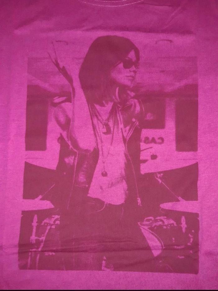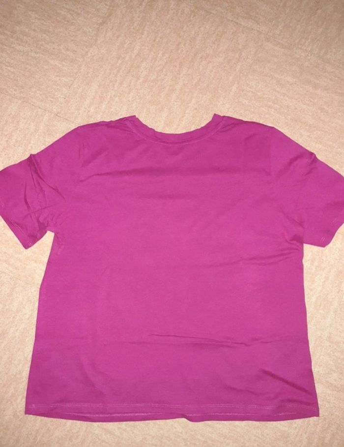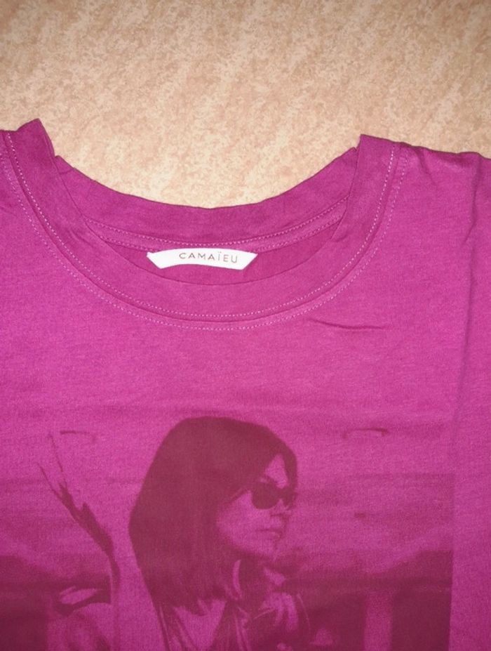 T-shirt Camaïeu, fushia avec imprimé femme, en très bon état, taille M, manches courtes/ col rond,100% coton
