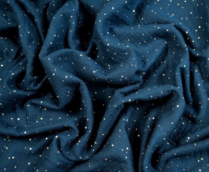 Double gaze de coton Couleur : bleu marine foncé Motif : pois dorés Poids : 125 g/m2 Largeur : 80cm Hauteur : 100 cm Certificat GOTS