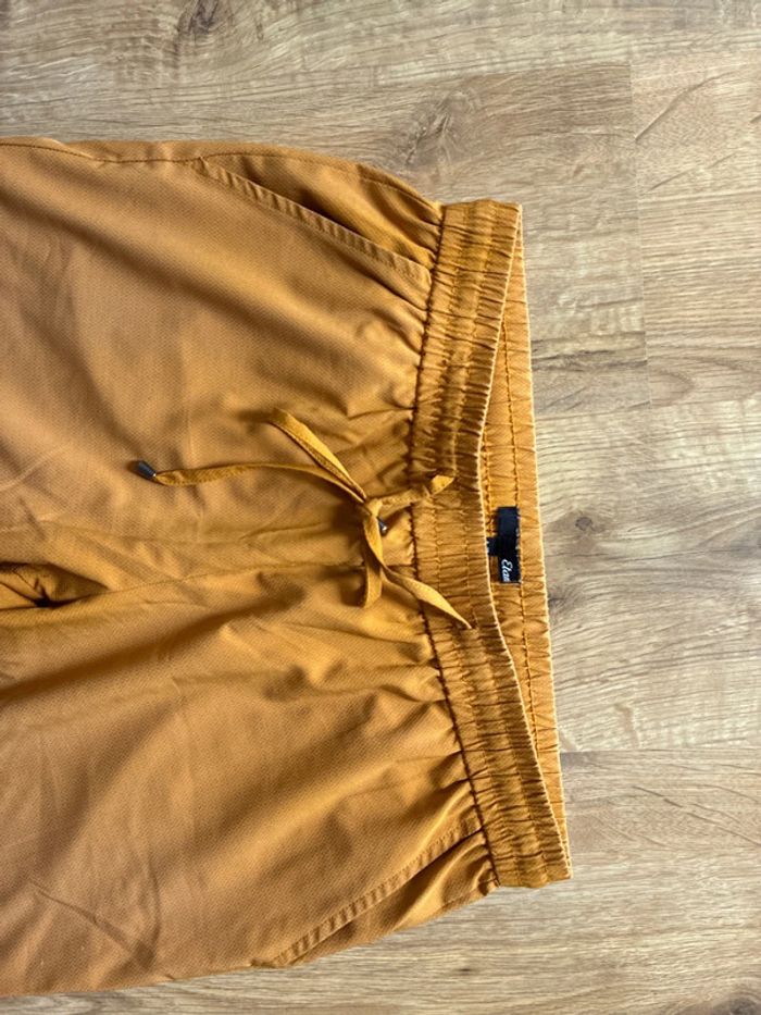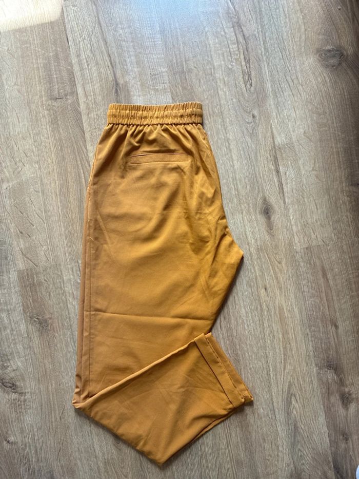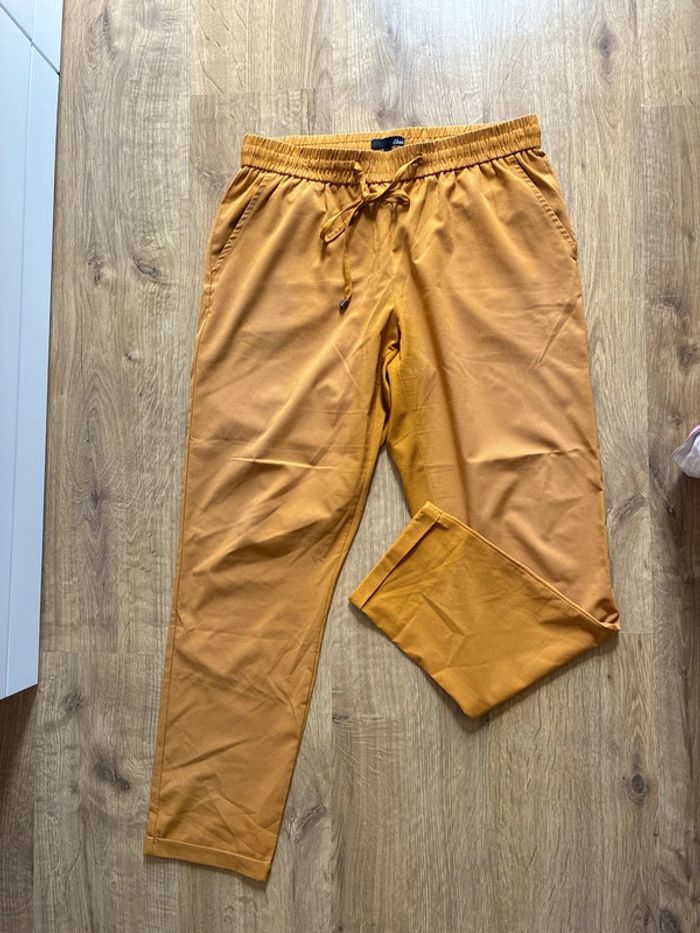 Vend ce pantalon jaune, léger Taille 38 Revers en bas de jambe cousu Taille élastique Fausse poche arrière, vrai poche avant sur le côté 8% Elasthane