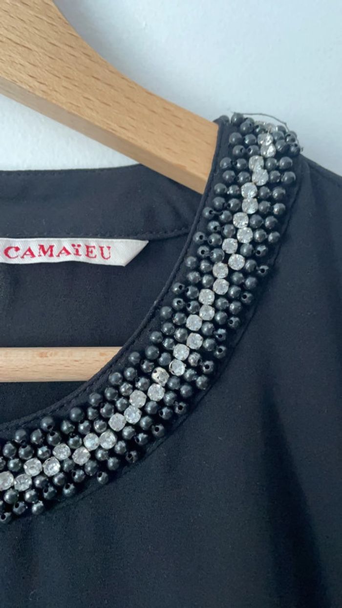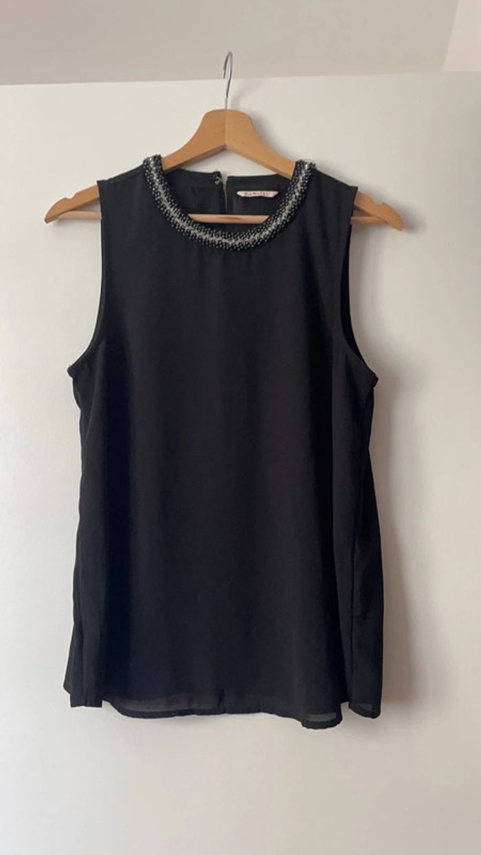 Vend une blouse san manches Avec perles et « diamants » sur le col Très fluide et légère. Doublée, non transparente