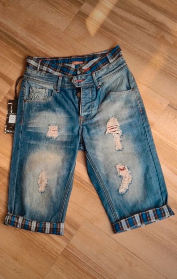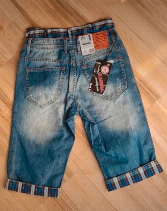 " RÉDUCTION SUR LOTS ACTIVÉS " Short US MARSHALL homme bleu T.38 Taille a plat a la ceinture 36cm Short avec poches devant et derrière , efect usé . Fermeture par bouton revert bas des jambes Double passage de ceinture à la taille . Matière : 100% coton Prix : 22€ Produit neuf , etiqueter authentique !!!