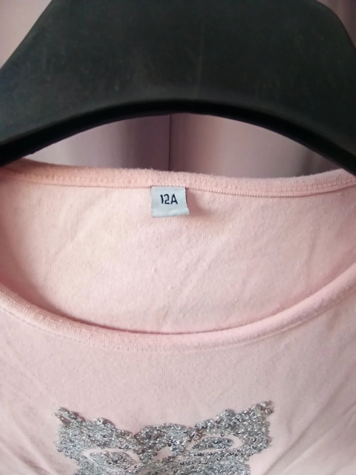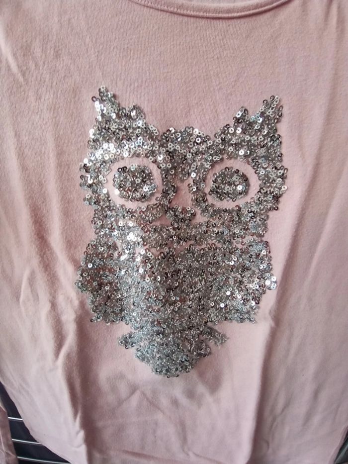 Tee shirt manches longues fille 12 ans rose clair imprimé hibou argenté. Bon état ni trou ni tâches mais quelques bouloches. #fille12ans_emeu2211 #fille_emeu2211