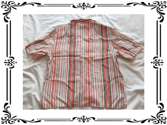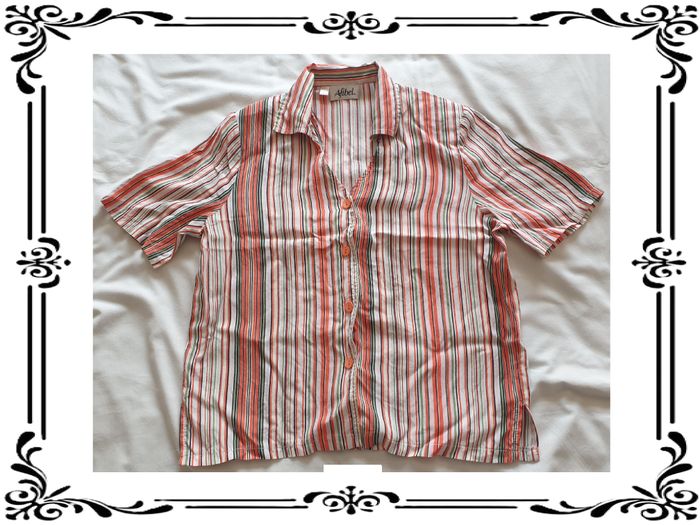 Chemise taille 40. Chemise manches courtes à rayures multicolores. Petites épaulettes. Tissu non extensible. Fentes sur 8 cm de chaque côtés en bas. Largeur d'épaule à épaule: 36 cm Largeur sous les bras : 48 cm Largeur à la taille: 49 cm Largeur en bas: 48 cm Hauteur de décolleté à partir des épaules : 18 cm Longueur totale: 56,5 cm Longueur des manches: 25 cm En très bon état. Afibel. 3€. #vero38110vetementsfemme40