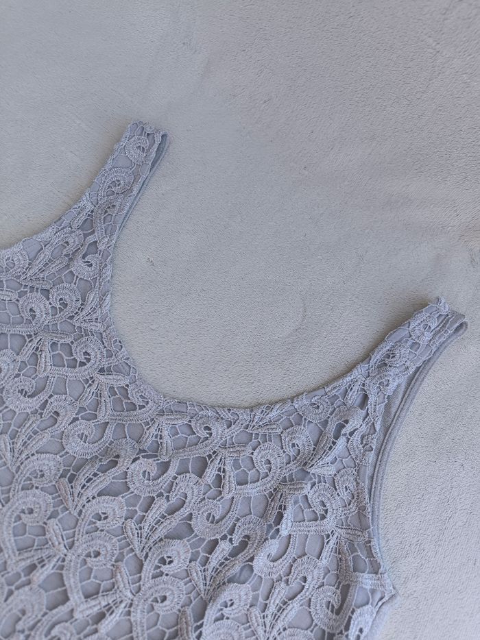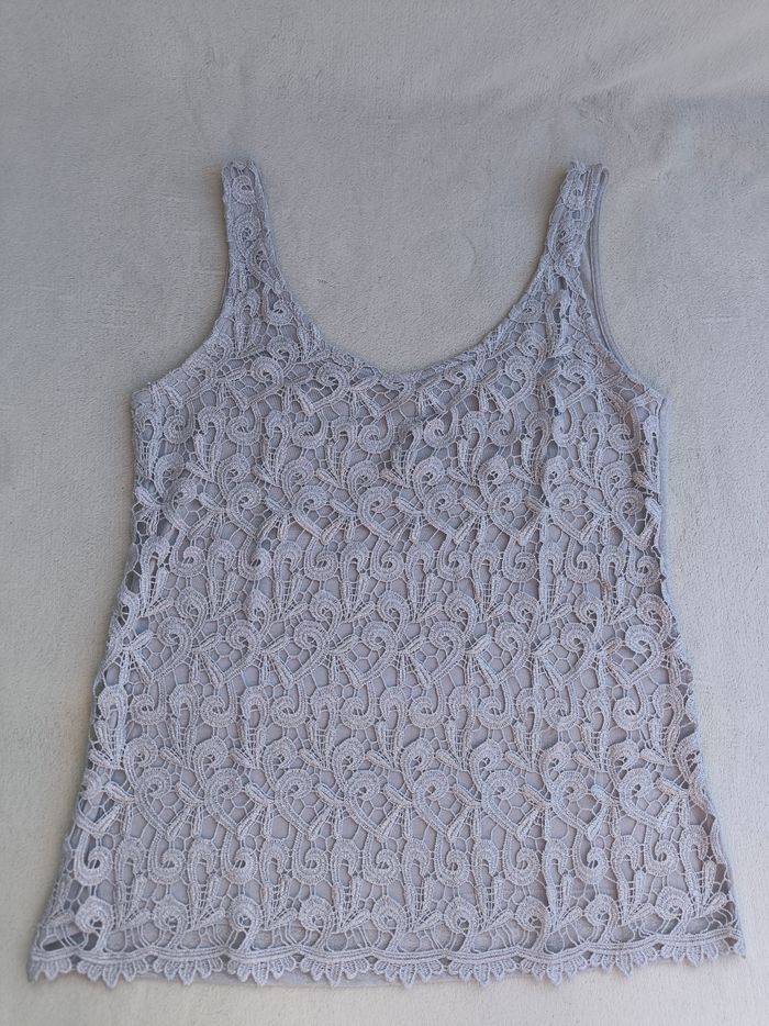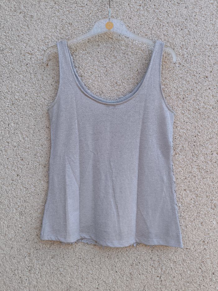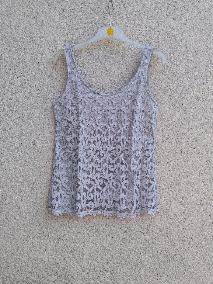 Débardeur à bretelles Marque Phildar Taille 38 • Coloris gris, argenté • Broderie à l'avant • Col rond • Doublure sur l'avant • Doublure avec taches de décoloration Largeur aisselle à aisselle non étirée : 41 cm Largeur aisselle à aisselle étirée au maximum : 57 cm Longueur totale : 61 cm Longueur aisselle : 40 cm En bon état #evelyne_taille_38
