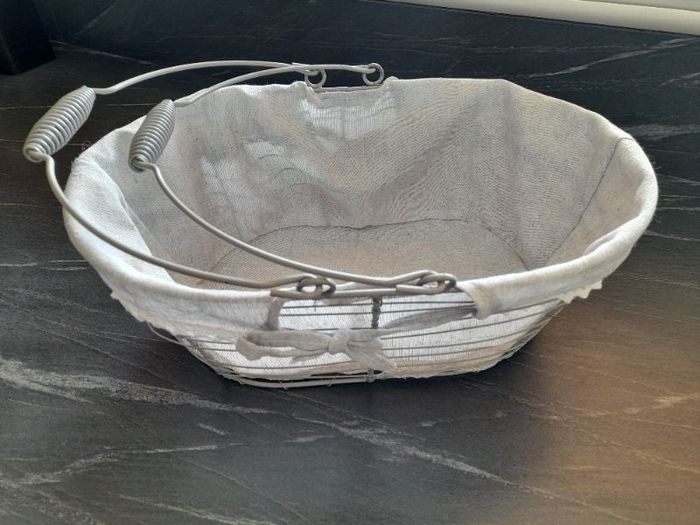 Panière en métal ,avec 2 anses , doublure tissu gris H 14 cm , 29cm avec anses en haut , L 35,5 cm l 25,5 cm Base 27 x17cm .