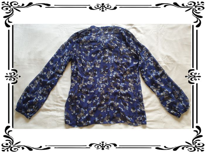 Chemise taille 40. Chemise manches longues en voile bleue avec tâches multicolores. Présence de deux liens de 52 cm pour la nouer à l’encolure. Tissu extensible sur 5 cm. Largeur d'épaule à épaule: 35 cm Largeur sous les bras : 47 cm Hauteur de décolleté à partir des épaules : 13 cm Longueur totale: 67 cm Longueur des manches: 62,5 cm En très bon état. Mystic. 3€. #vero38110vetementsfemme40