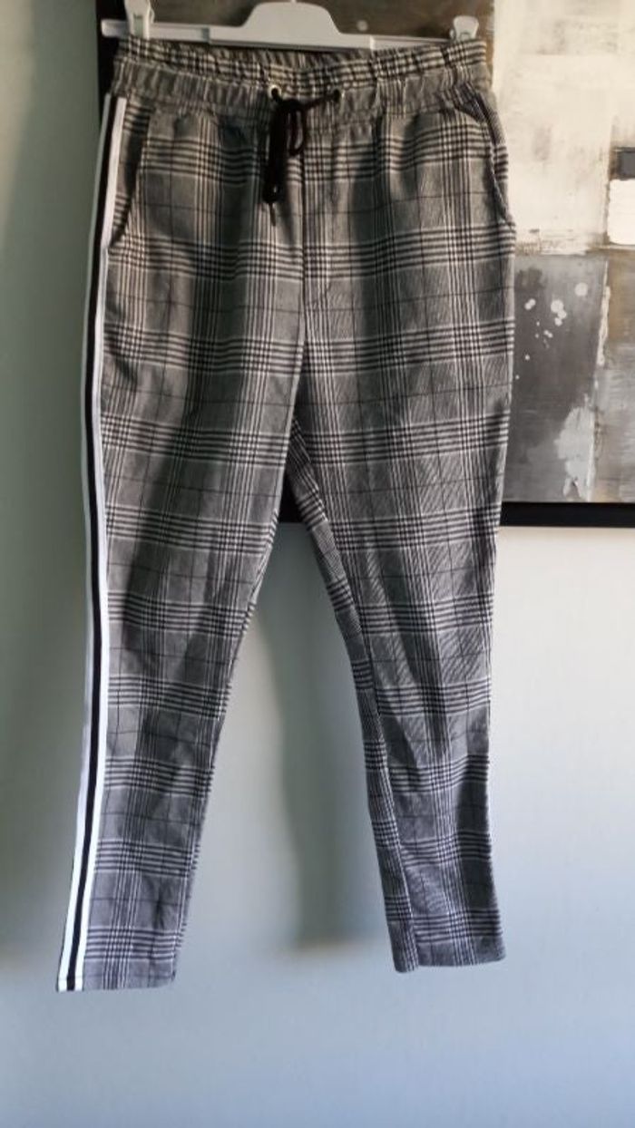 Pantalon carreaux Uniplay Carreaux gris noir blanc avec bandes sur les côtés 2 poches côté 1 poche arrière Longueur 92 cm 60 % coton – 37 % polyester – 3 % spendex Taille S #homme_imoddeco