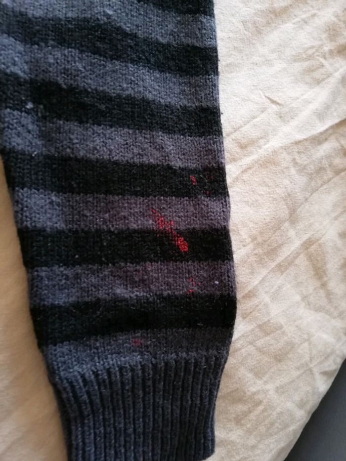 Tâche de peinture manches gilet rayé bouloches Petite tâche derrière le sous pull #bdodo1234vetementsgarcon24mois