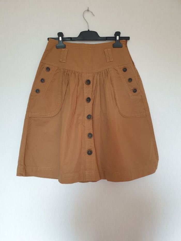 Jupe évasée, taille haute, longueur genoux, boutons devant, fermeture sur le côté, grandes poches devant, Promod, taille 34 Coton Taille à plat : 35 cm Longueur : 60 cm environ #pauliiiinefemme34