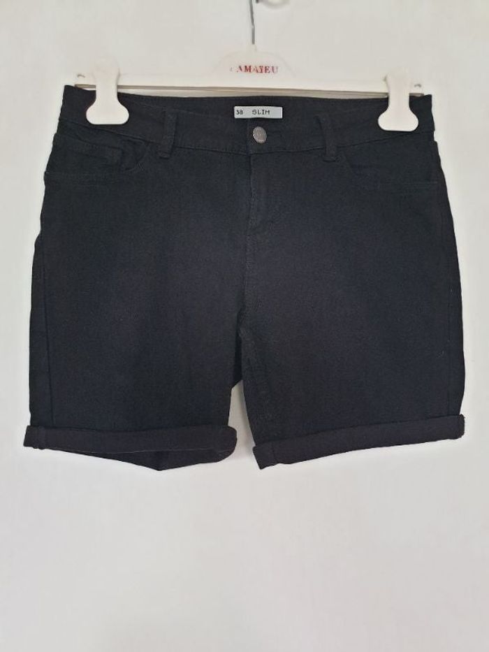 Short en jean / denim, noir, coupe slim, ouverture boutonnée et zippée, 2 poches devant, 2 poches plaquées au dos, revers sur le bas des jambes, matière stretch Kiabi, taille 38 Coton et élasthanne Porté 2 fois Taille à plat : 37 cm environ Longueur entrejambe : 13 cm environ Largeur bas de jambe : 21 cm environ #pauliiiinefemme38