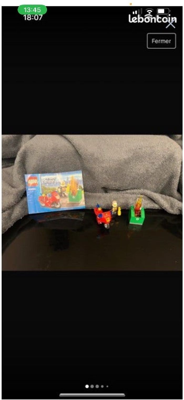Vends un lego city, en très bon état, sans la boîte, qui se compose d'une moto d'une poubelle en feu et d'un personnage, complet. Référence : 60000