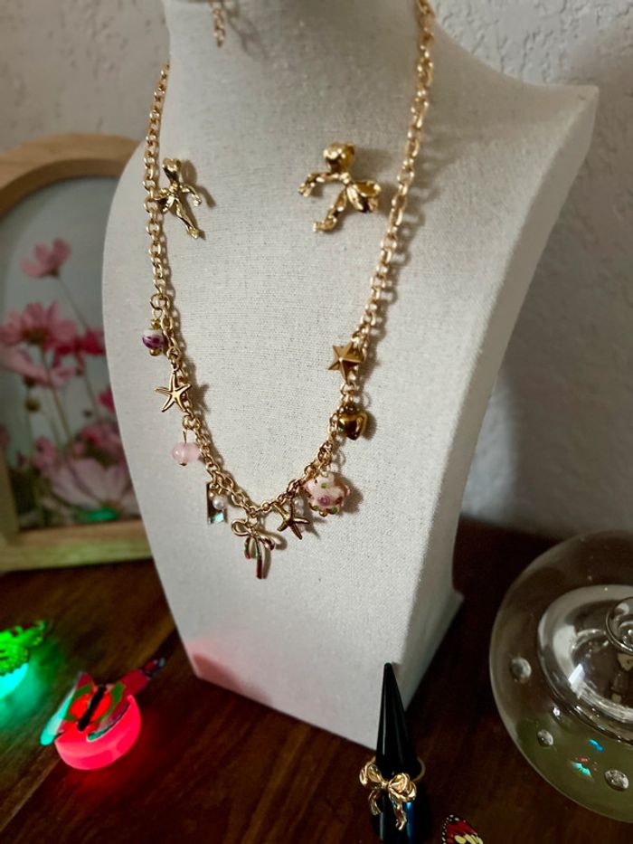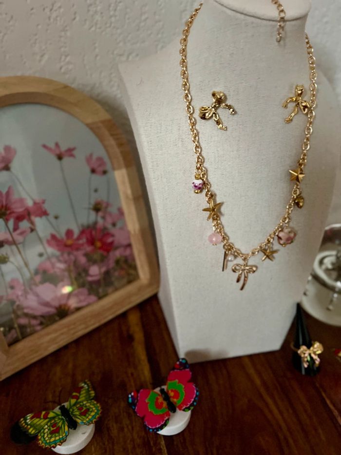Magnifique ensemble d'un collier à breloques noeud 🎁 et bague ajustable ainsi que ses boucles d'oreilles assorties en acier inoxydable neufs