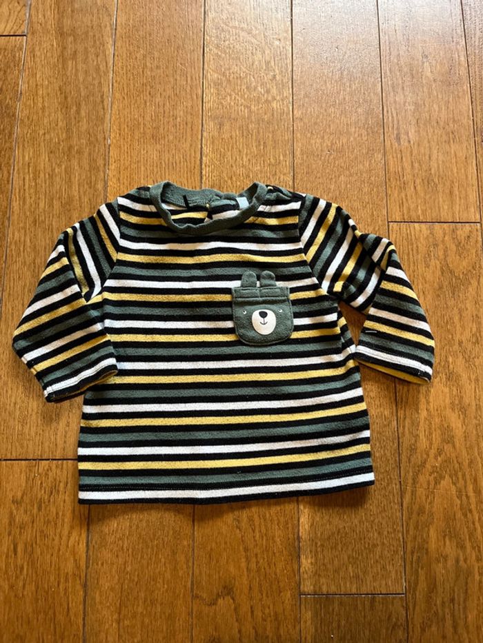 Ensemble composer d’un t-shirt à manches longues rayé jaune noir blanc et vert fermeture boutons dans le dos et pentalon style cargo ceinture et cheville élastique matière confortable et souple. #ophech766mois #ensemblebebe #ensemble6mois #ensemblebébégarçon #kaki #lotvetements #jumeauxetplus #jumeaux