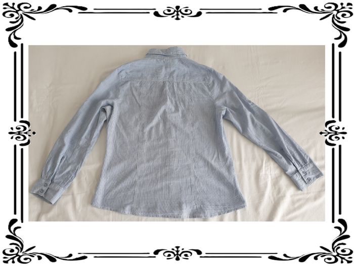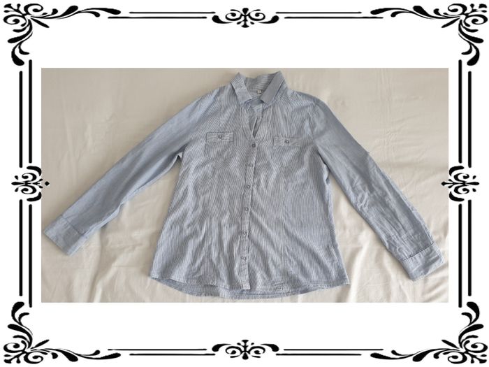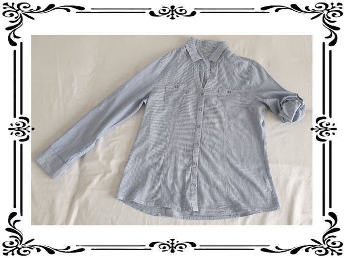 Chemisier taille 40. Chemisier bleu à rayures blanches. Une poche poitrine de chaque côté. Possibilité de revers aux manches. Noté 42 mais taille petit. 100 % coton. Largeur d'épaule à épaule: 36 cm Largeur sous les bras: 49 cm Largeur à la taille : 44,5 cm Largeur en bas : 53 cm Hauteur du décolleté à partir du haut des épaules : 18 cm Longueur totale: 64 cm Longueur des manches: 28 ou 57 cm En très bon état. Sans marque. 3,00€. #vero38110vetementsfemme40