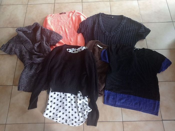 Lot indissociable. Petit prix. Très bon état. - Pull/tunique noir à pois "Etam" - Pull ajouré bleu marine manches courtes "Carling" - Pull orange fluo "Cache Cache" - Gilet gris "Etam" - Pull léger noir et bleu manches courtes "Etam" - Gilet marron cache coeur "Yessica"