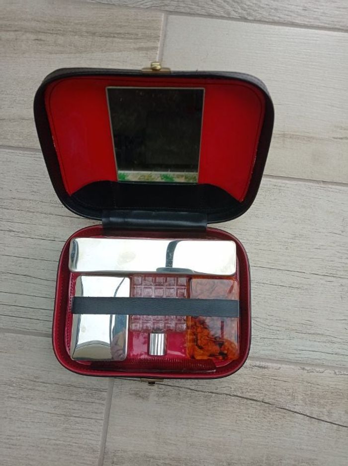 Contient 2 boîtes vides pour ranger savon, brosse à dent..., brosse, chausse pied, peigne et flacon en verre.