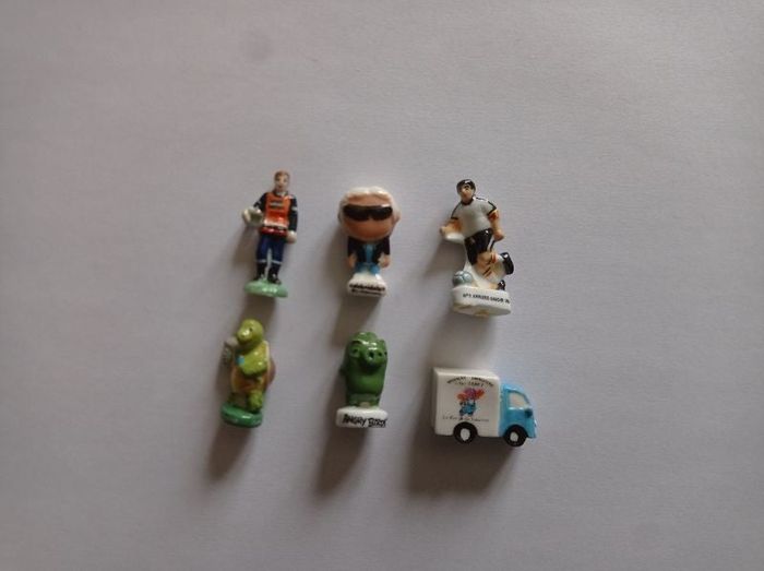 Lot de 6 fèves - Thèmes variés (angry birds/Verne/Karl Lagerfeld/Foot/pompier/Roi de la saucisse)