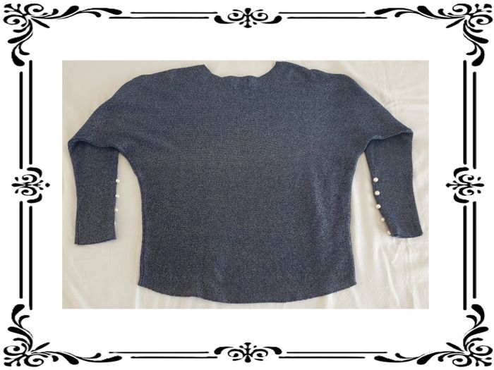 Pull taille 40. Pull fin bleu avec fil argenté. Boutons blancs décoratifs en bas des manches. Tissu extensible sur 7 cm. Largeur sous les bras : 50 cm Largeur à la taille : 44 cm Hauteur du décolleté à partir des épaules: 7 cm Longueur totale: 56 cm Longueur des manches à partir de l’encolure: 58 cm En très bon état. Miss Sara. 3€. #vero38110vetementsfemme40