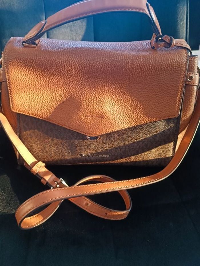 Sac à main Michael Kors avec bandoulière avec une pochette extérieure et deux pochettes à l'intérieur du sac. Petit défaut sur le fermoir du sac voir dernière photo Couleur marron et camel