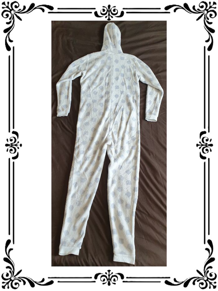 Pyjama taille 40. Pyjama combinaison blanc avec motifs têtes d’ourson gris avec capuche et petites poches. 100 % polyester. Largeur d’épaule à épaule : 40 cm Largeur sous les bras : 51 cm Largeur à la taille : 46 cm Longueur totale hors capuche : 150 cm Longueur des manches : 59 cm Longueur de la fermeture éclair : 52 cm Longueur de jambe à partir de l’entrejambe : 77 cm En très bon état. Sans marque. 5€. #vero38110vetementsfemme40