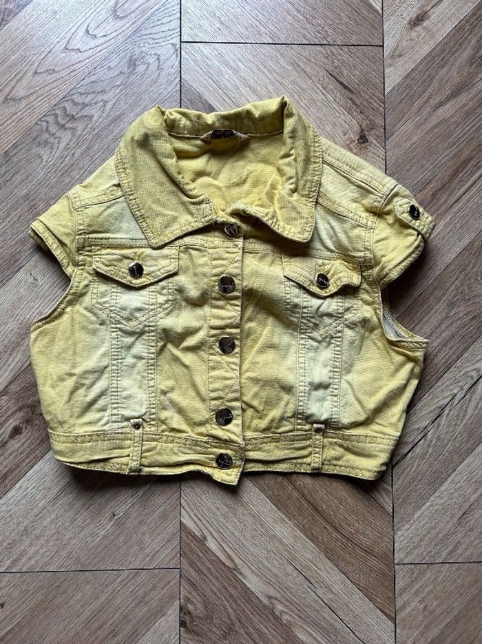 Boléro, gilet sans manches en jean 👖 Coloris jaune poussin 🐤 Marque One more Taille S-M La dernière photo présente une possibilité de look, le short est également disponible dans mon dressing