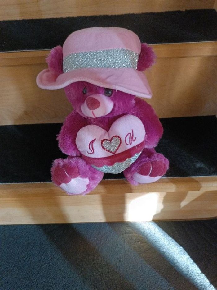 Peluche ourson rose/fuchsia Toy's Compagny. Hauteur 30 cm. Chapeau et coeur paillettes argentées. Lien d'attache au dos. Neuf.