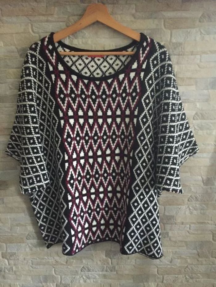 Pull chauve-souris Tissaia 42/44, bordeaux, noir, blanc, envergure 102 cm, hauteur 70 cm, largeur base 68 cm, 100% acrylique - TBE