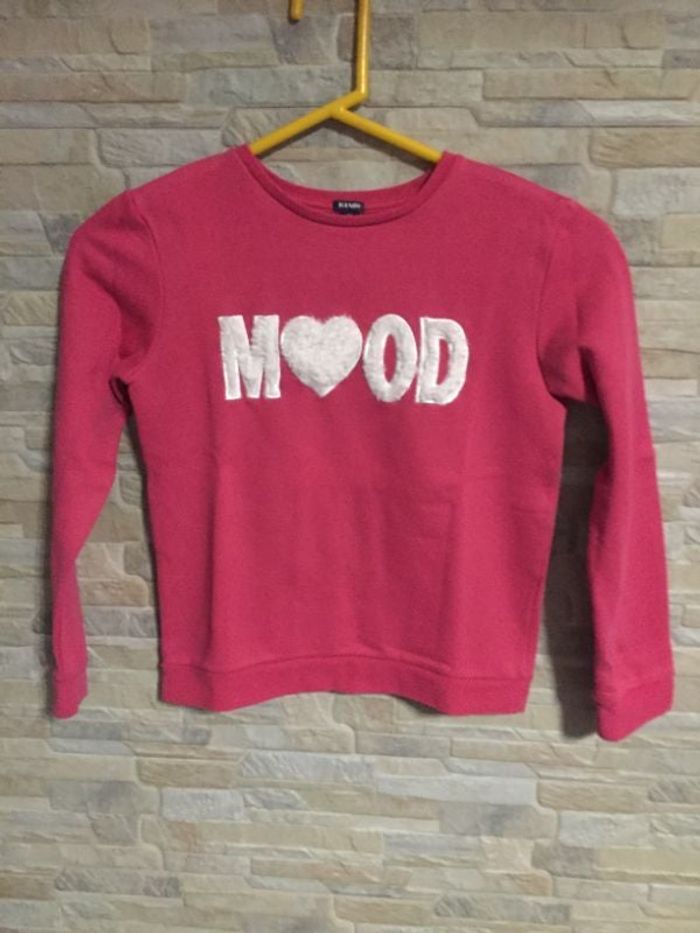 Sweat fuchsia Kiabi 10A, "Mood" en moumoute, (un point de feutre bleu devant). Molleton coton, polyester - TBE