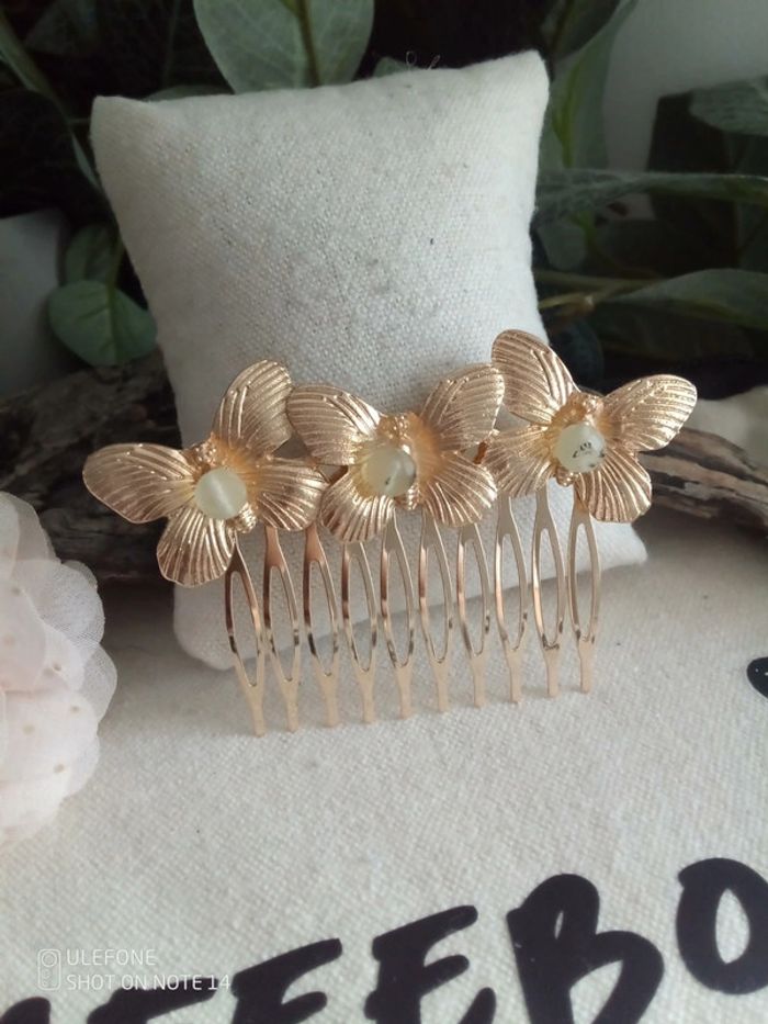 Barrette peigne papillons dorés et pierres de jade phrénite - photo numéro 1
