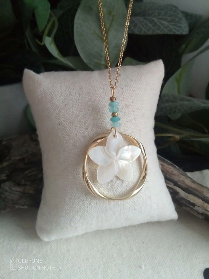 Collier fleur de nacre et pierres amazonite - photo numéro 1