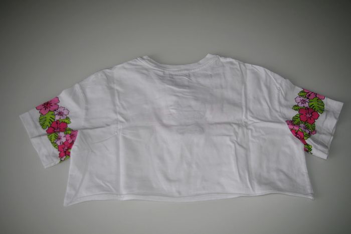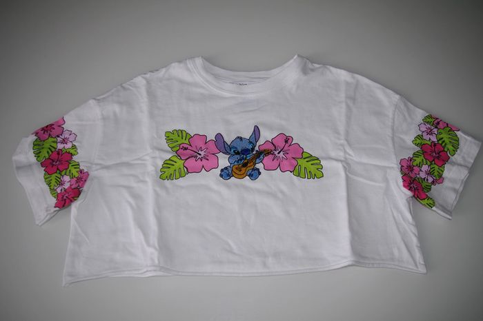Pour voir mes articles classés par taille, cliquez sur #fille10anssarah75015 #fille11anssarah75015 #fille12anssarah75015 tee shirt, coupe crop, en coton, blanc à motifs STITCH, marque: BERSHKA, pour fille taille 10ans 11ans 12ans, très propre, sans aucun trous ni taches