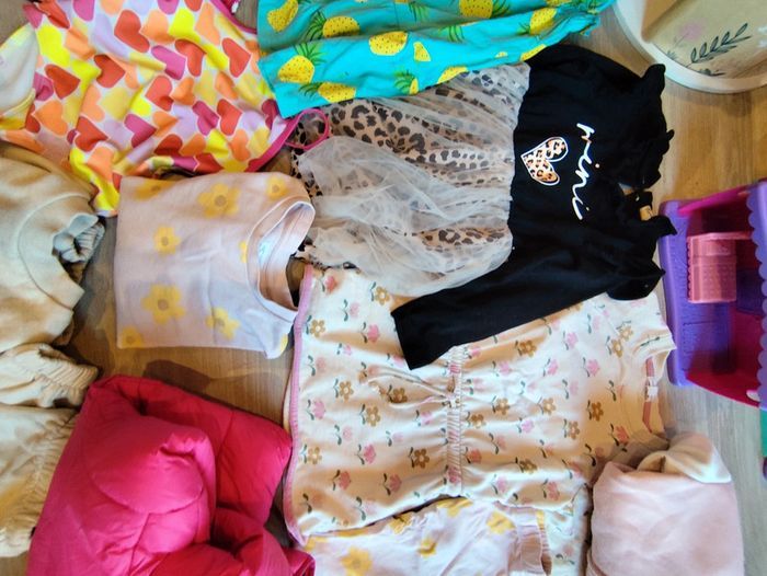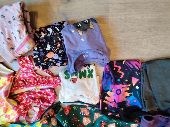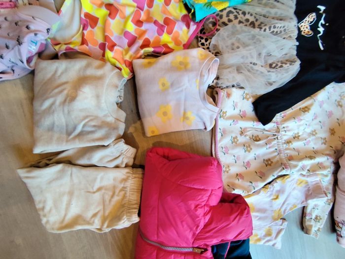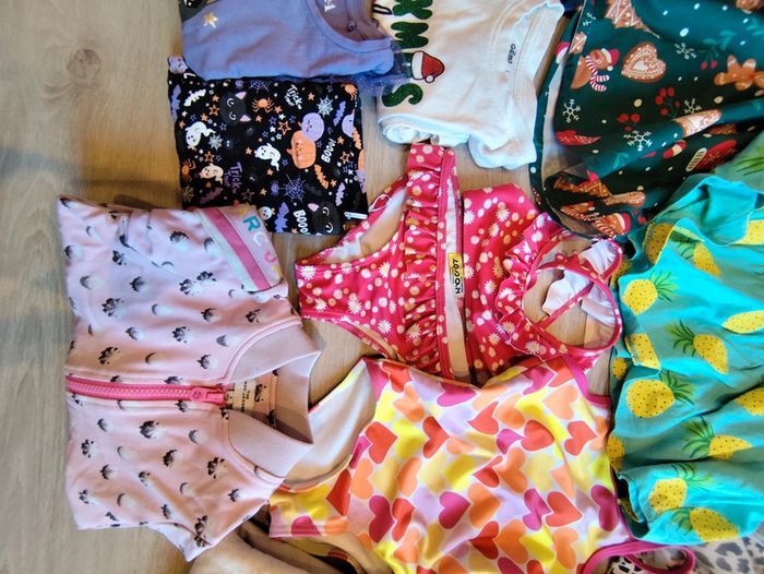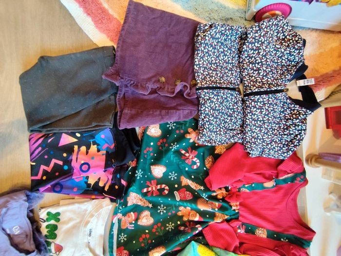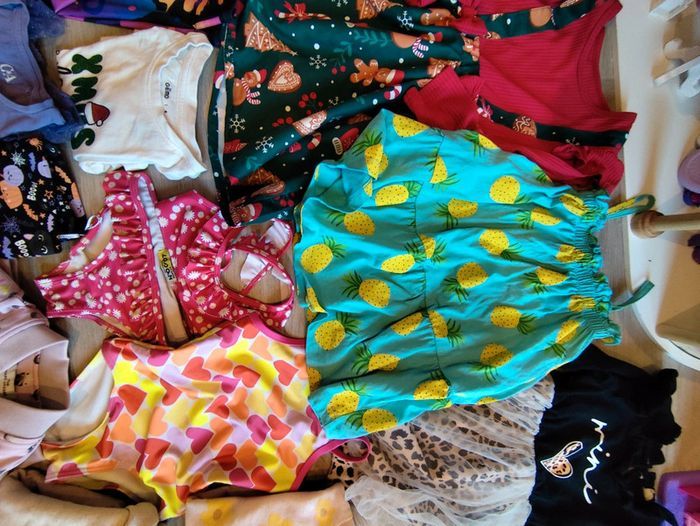 Un peu de tout en 3 et 4 ans. En 3 ans: Deux gilets zippés Une jupe Deux leggings Un maillot de bain 2 pièces Une robe a bretelles En 4 ans: Un ensemble halloween Robe noël T-shirt manches longues noël Un maillot de bain une pièce Un ensemble legging sweat Un ensemble jogging sweat Un gilet marc Jacobs Deux robe manche longues Un teddy rose Une doudoune chaude deux ponts de feutres ne partent pas sur le jogging beige comme montré en photo