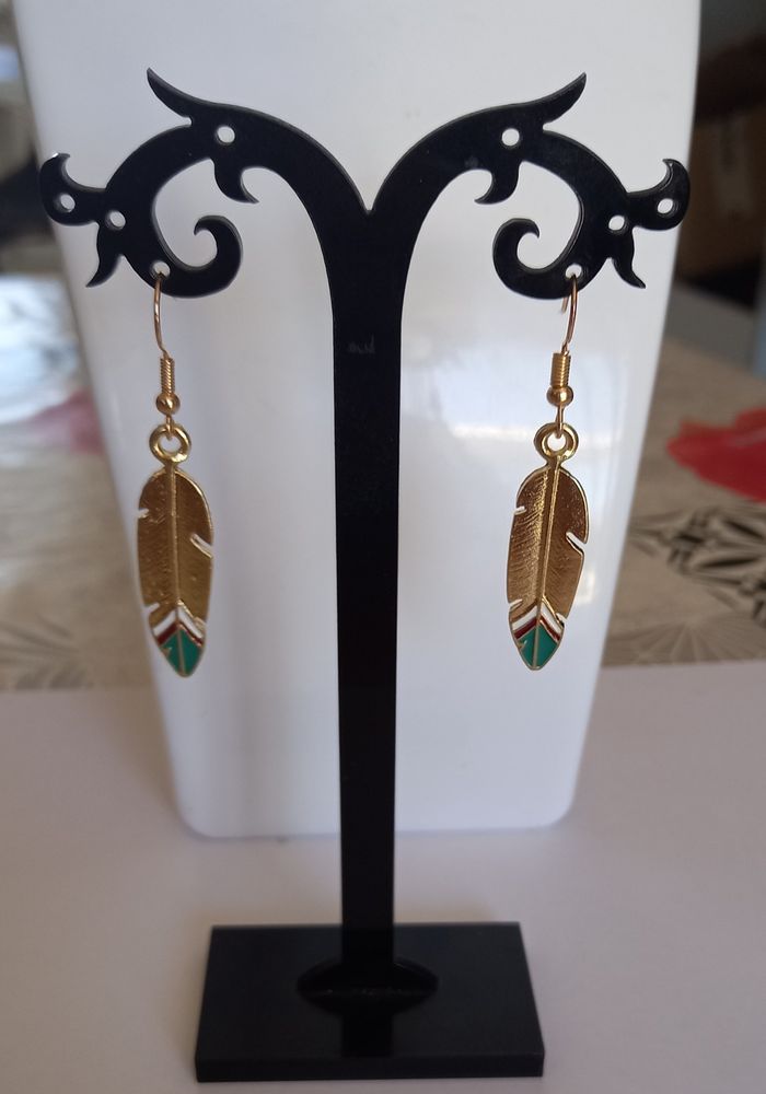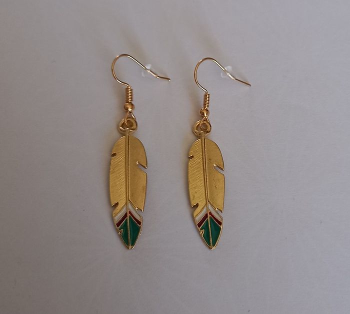 1 jolie paire de boucles d'oreilles motif plume. Coloris doré. Hauteur totale : 5,2 cms. Boucles neuves sous blister. N'hésitez pas à regarder mes autres ventes . Envoi rapide et soigné.