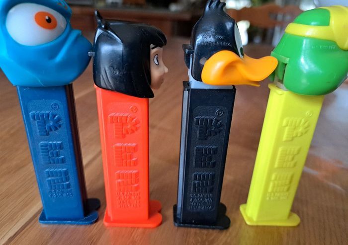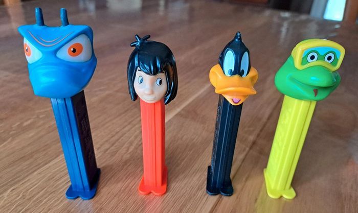 Vends lot de 4 distributeurs de bonbons PEZ, vintage. Mowgli (Livre de la Jungle Disney) Daffy Duck (Looney Tunes) de 1998 Frog (Crazy animals - grenouille) de 1999 Barney Beetle Bugz de 2000, ses antennes sont cassées.