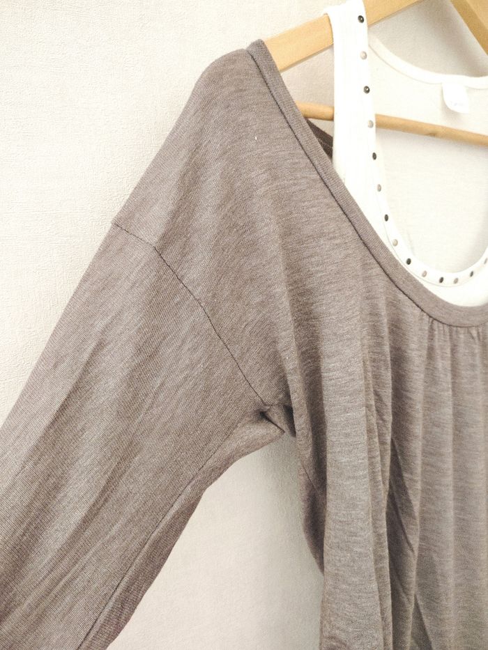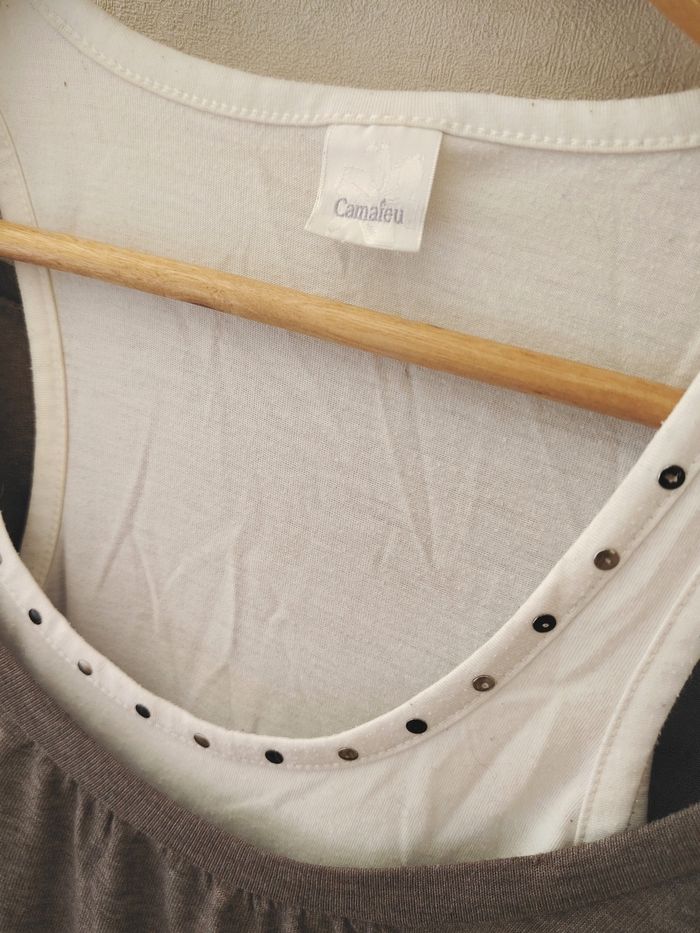 Haut t-shirt débardeur 2 en 1 Débardeur blanc incorporé au t-shirt marron clair manches 3/4 Taille 38 /M Marque Camaieu