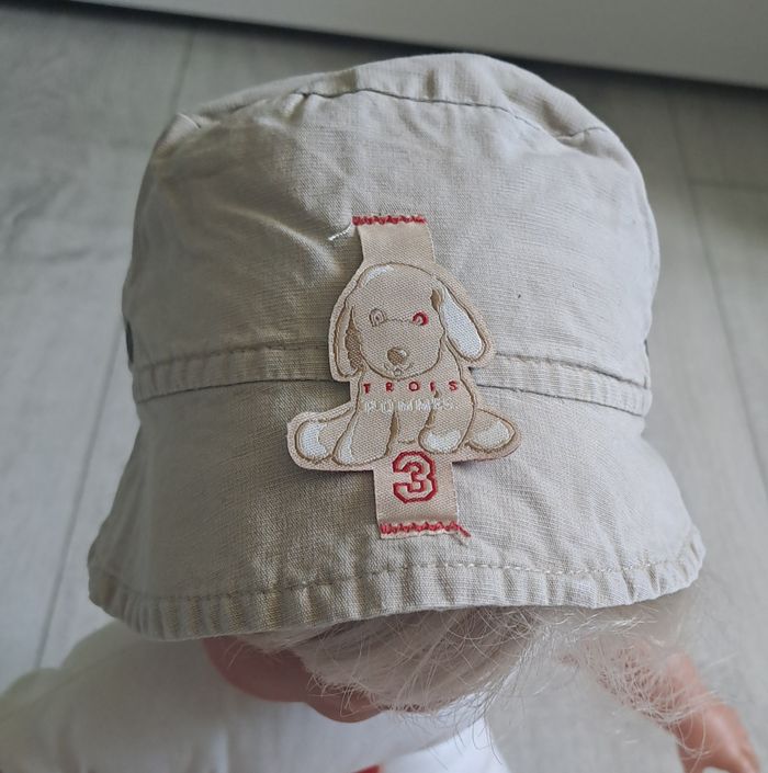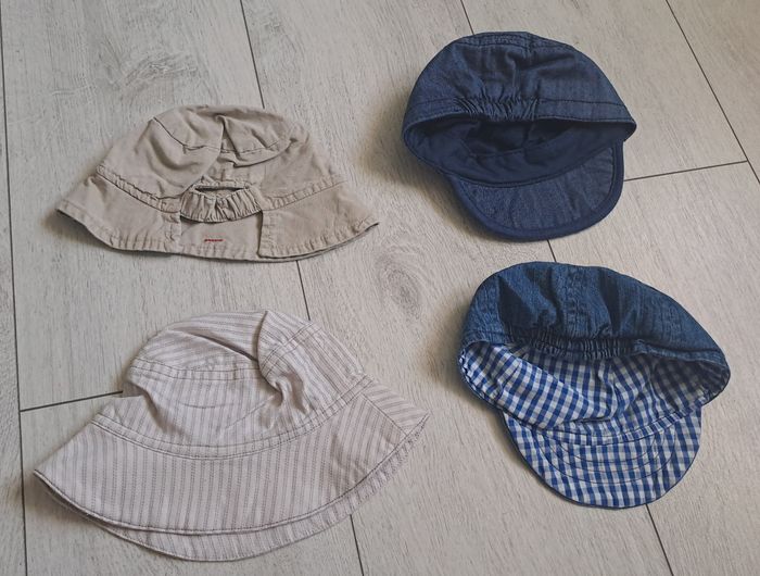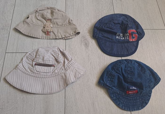 Lot de 4 chapeaux pour bébés garçons taille 1mois en bon état ! * Le premier, bob beige avec petit chien sur le devant de la marque 3 pommes. * Le deuxième, bob rayé beige et blanc de la marque Bébé 9. * Le troisième, casquette en jean de la marque Z Grain De Blé. * Le quatrième, casquette en jean de la marque Disney Baby.