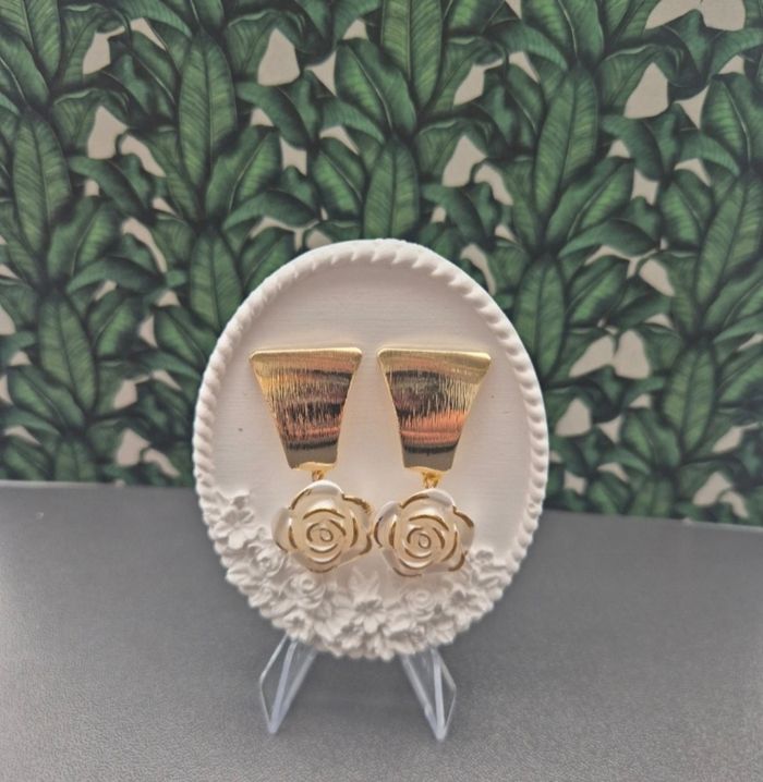 Boucles d'oreilles : clous en métal doré, fermoirs en caoutchouc transparent, perles fleurs nacrées blanches et dorées. Longueur approximative : 4 cm.